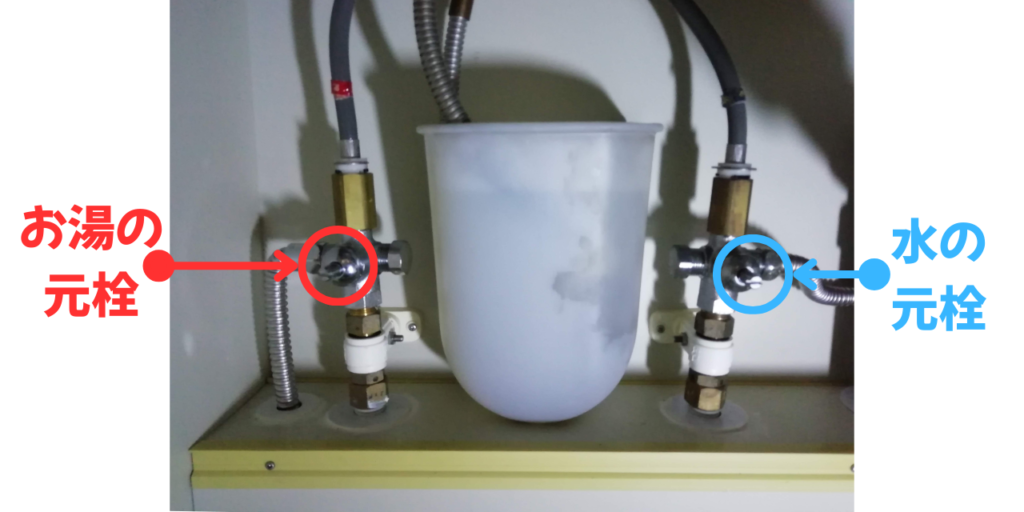 まずはシンク下の止水栓(給水・給湯)を締めます。