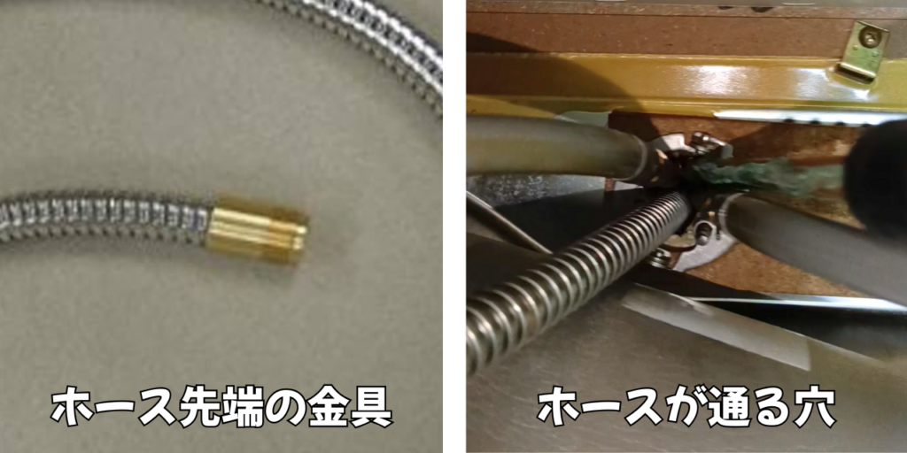 シンク下に潜り込み、先ほどフリーにした給水・給湯ホースをゆさゆさと揺さぶりながら、上からホースをガシガシ差し込むと、なんとか通り抜けました!