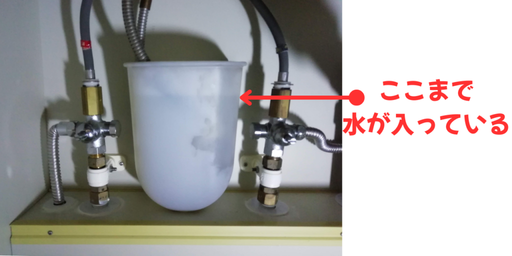 恐る恐るシンク下のキャビネットを開けてみると・・・ホースを収納する水受け容器に、たっぷりと水が溜まっていました。これはマズい。