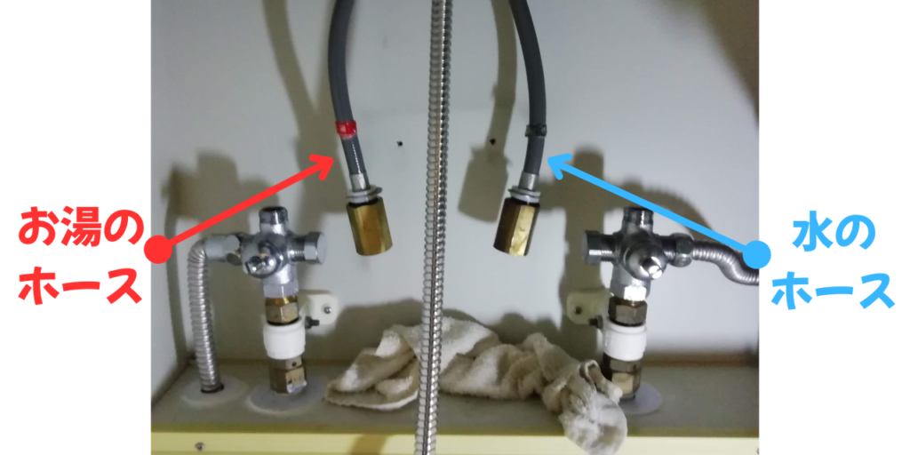 どうしたらいいのかわからず、とりあえず、止水栓から給水と給湯のホースを外してみることに。
