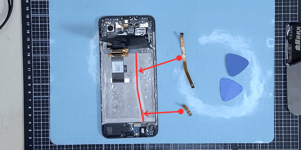 バッテリーは強力な両面テープで固定されています。これを剥がすのが一番大変でした。僕はヘラを使って無理やり剥がそうとした結果、バッテリー裏のフラットケーブルを切ってしまいました。仕方ないのでこのケーブルは取り付けずに立てました。おかげでイヤホンは使えなくなりましたが、スマホの他の機能には影響がありませんでした。