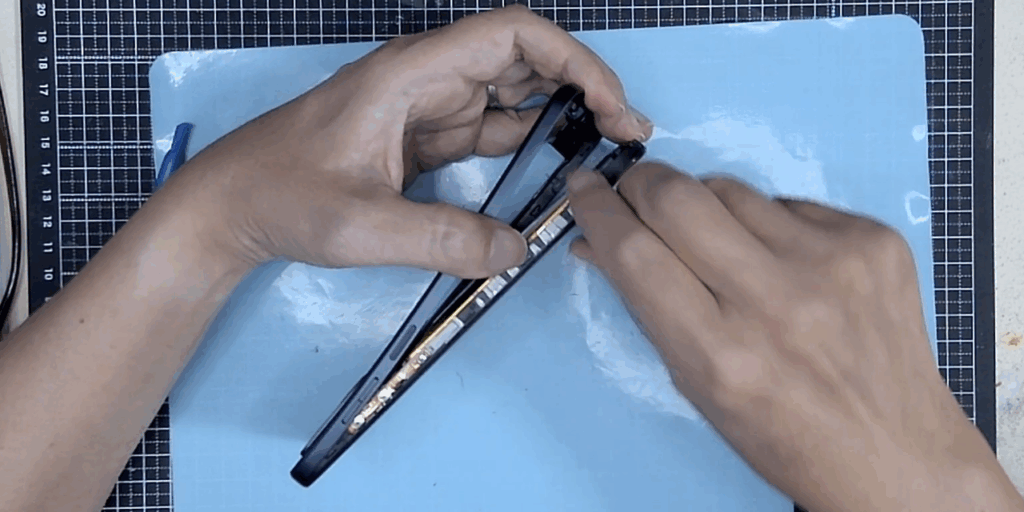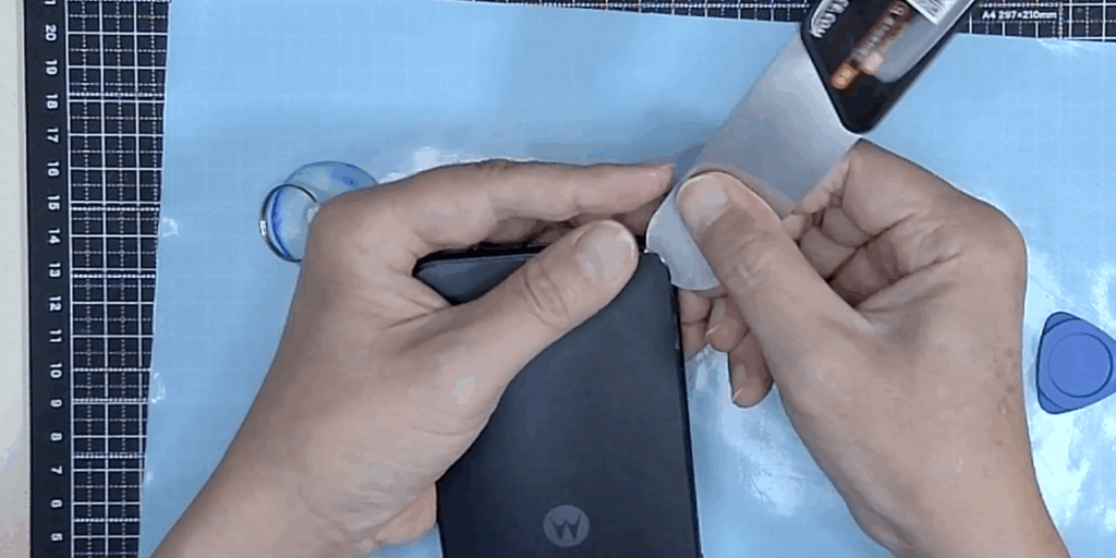 - 裏カバーとバッテリーを外すと際は、無水アルコールやイソプロピルアルコールを使って粘着剤を溶かしながら作業する。