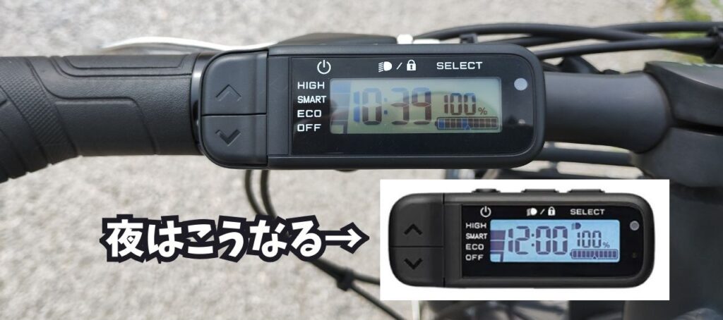 操作パネルのLCDに時計が表示されています。通勤中、サッと時刻が確認できるのは想像以上に便利。あと、青色バックライトがカッコいい。